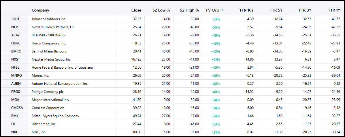 Here are the top dividend contenders trading below fair value according to Portfolio Insight. A dividend contender are those companies who have raised their dividends for 10+ years at a minimum and up to 24 years. After that, a stock would be a dividend aristocrat that has been able to rise for 25+ years. Fair value is based on historical P/E multiple relative to where these names are trading currently.